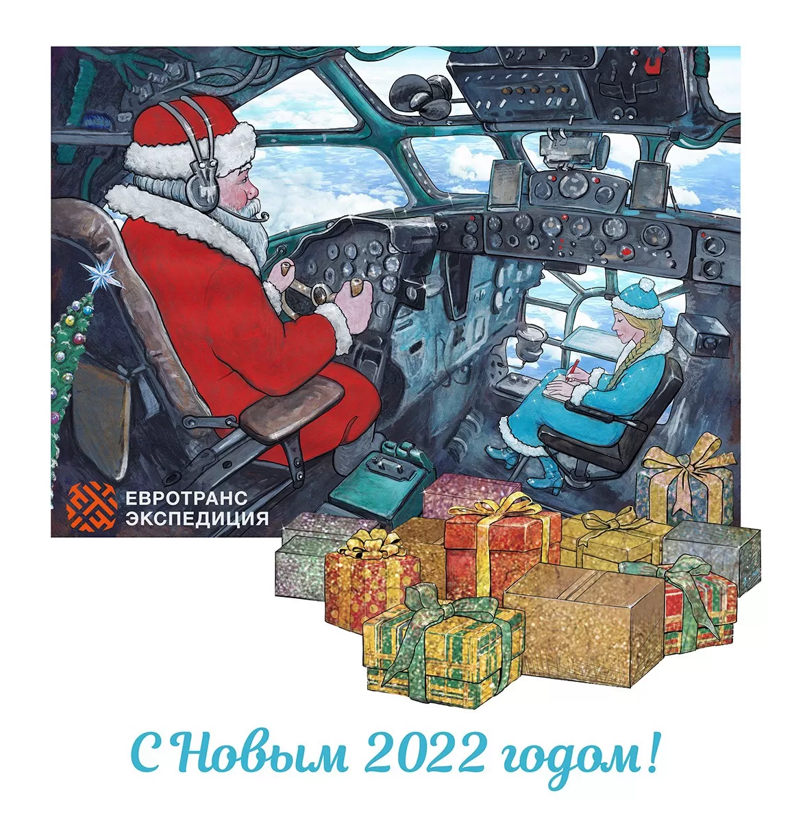 На новогодней открытке, которую мы отрисовали к 2022 году изображен Дед Мороз, который везет подарки в легендарном советском бомбардировщике Ту-4. В кабине самолета за штурвалом сидит Дед Мороз, а на месте корректировщика Снегурочка, которая сбрасывает новогодние подарки точно в цель!