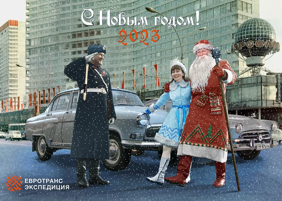 Для текста «С Новым годом! 2023» специально вручную перерисован шрифт «Фантазия» из каталога 30-х годов. Наложение текста поверх окон, плюс снежинки, ассоциируются с титрами фильма «Ирония судьбы или С лёгким паром!».