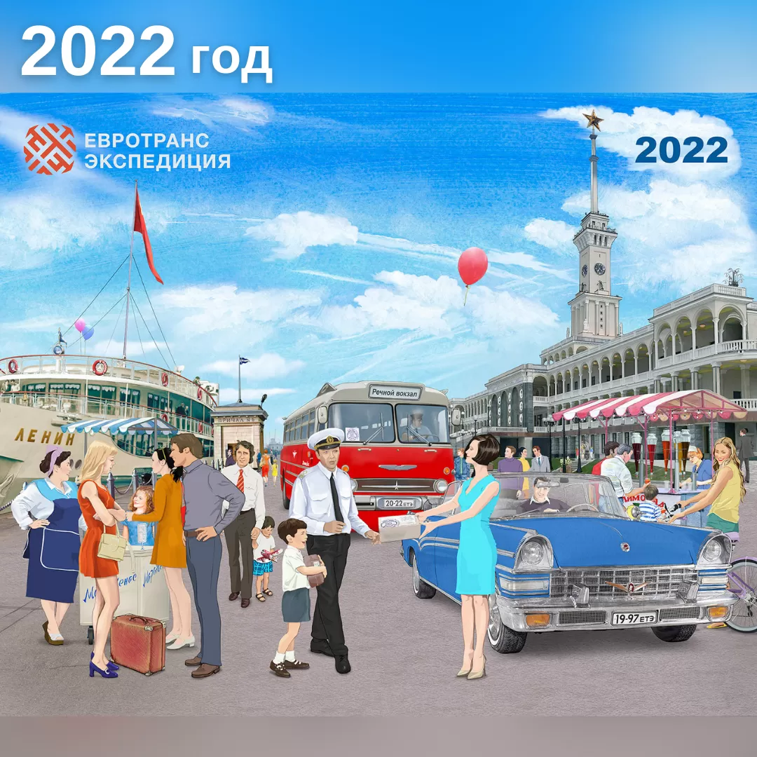 На календаре изображена сцена их 70-х на Северном речном вокзале. Если вы приглядитесь, то увидите лимузин-кабриолет ЗИЛ-111В, на котором мы доставили срочный груз для капитана теплохода «Ленин».